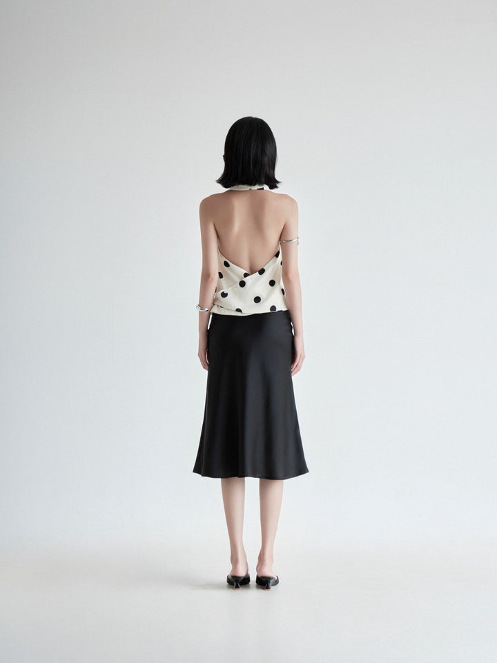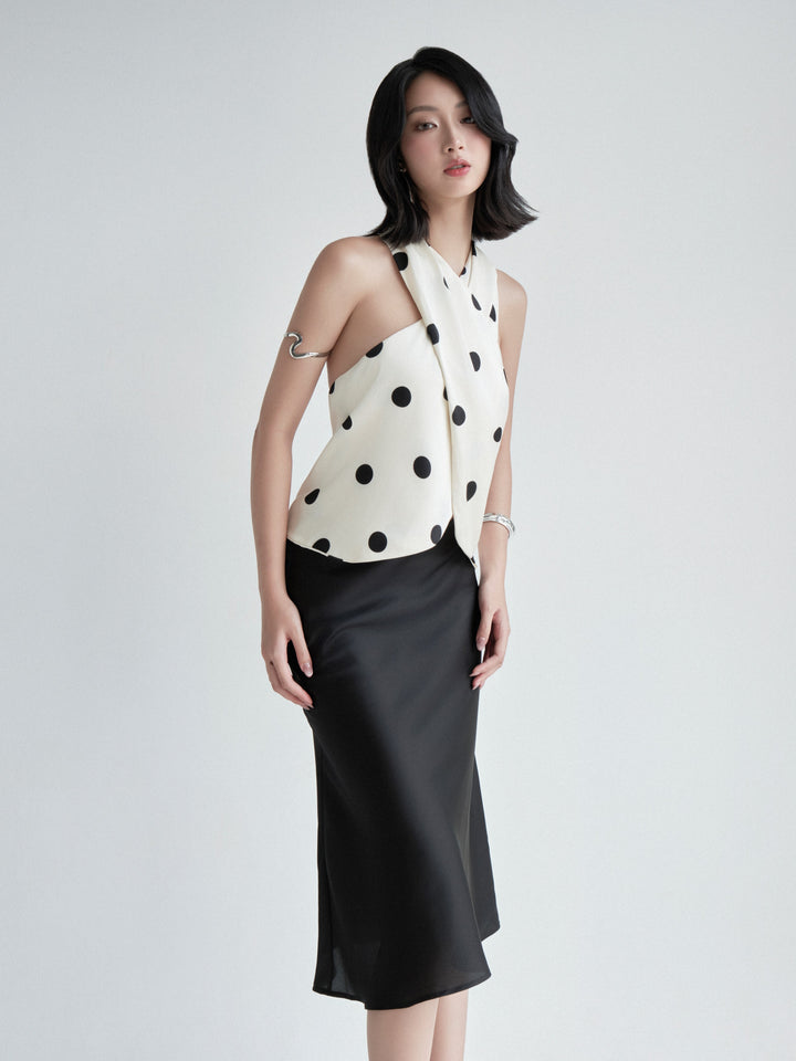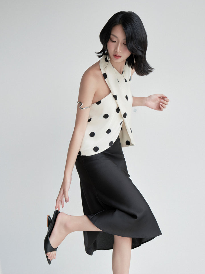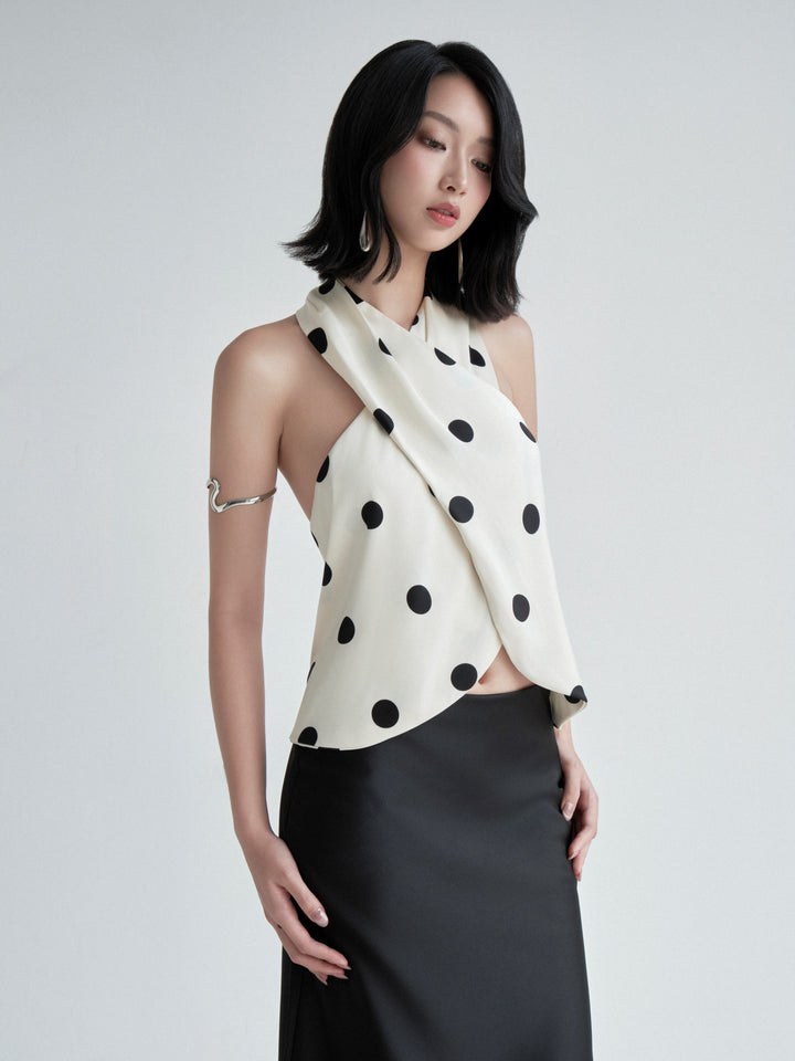 This elegant top is crafted from luxurious silk fabric, providing a soft hand and beautiful drape.It features a striking, contemporary design with a cross-front halter neckline that exposes the shoulders and back. The fabric is adorned with a classic black polka dot pattern against a light background.