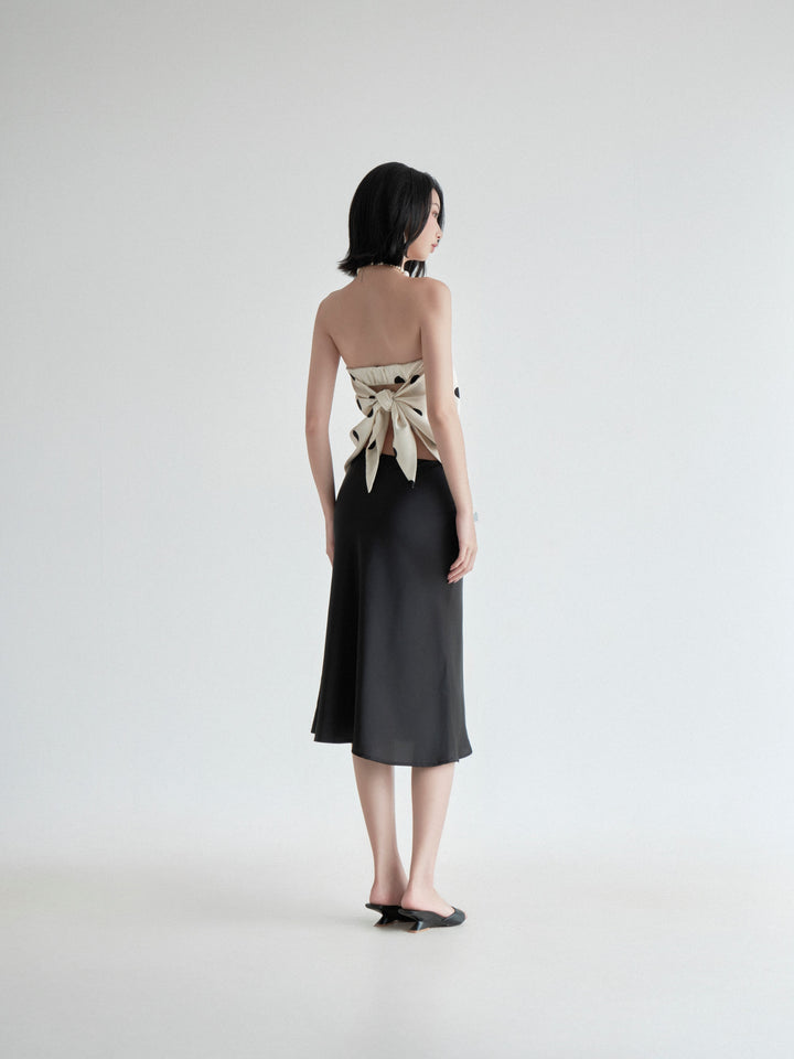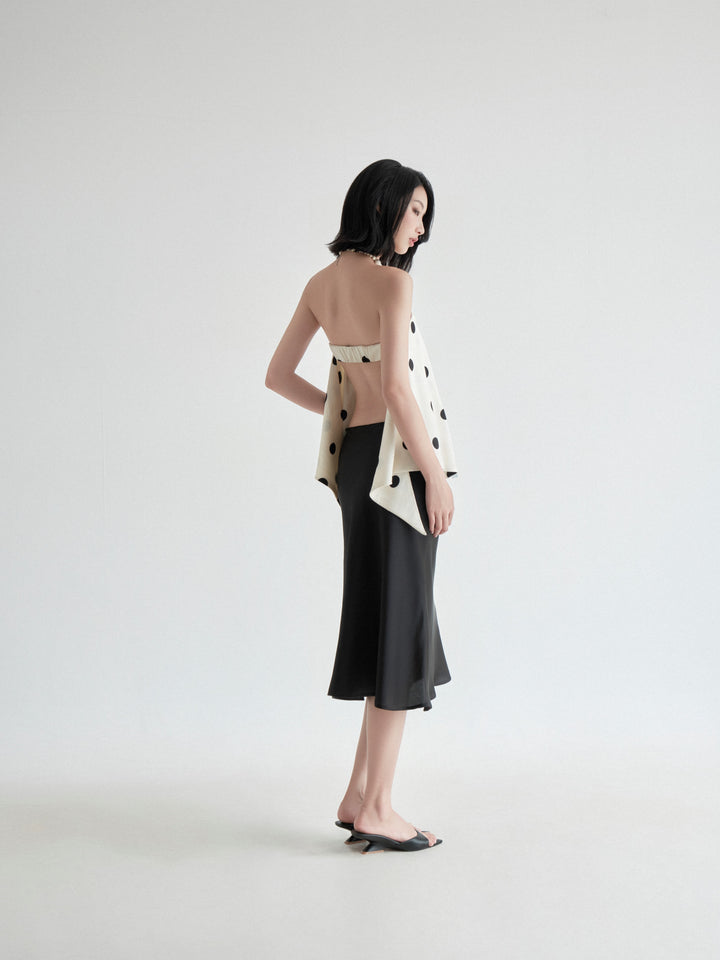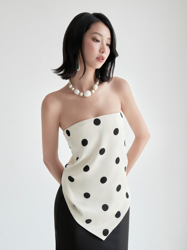 This eye-catching top offers a modern, luxurious take on the polka dot motif. It is expertly crafted from smooth silk fabric, providing a fluid drape and comfortable feel.The design features a strapless tube top silhouette with a large black polka dot pattern against a light background. Its most distinct elements are the dramatic asymmetrical handkerchief hem and the adjustable, tie-back closure, which creates a large bow detail at the back. This piece is a glamorous and fashionable statement top.