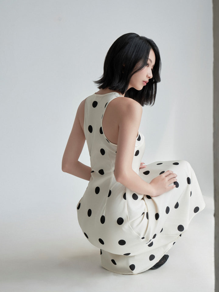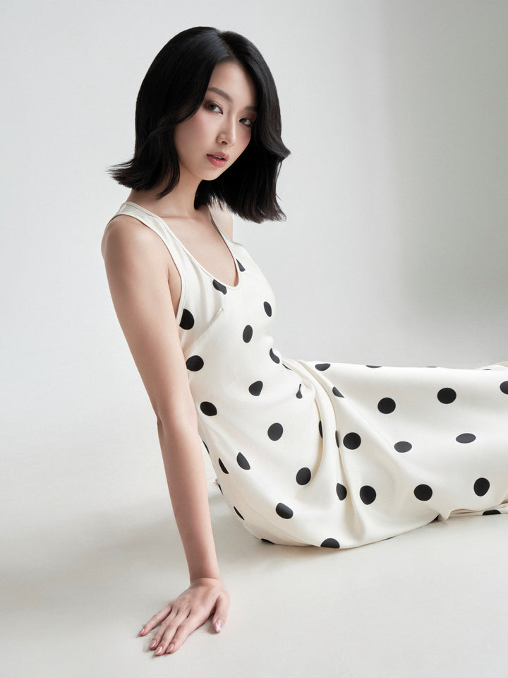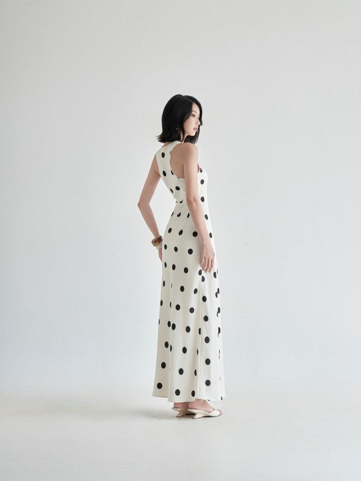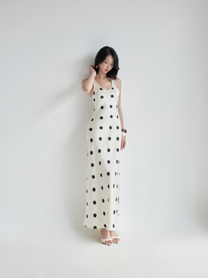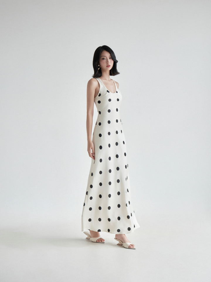 This elegant maxi dress embodies effortless sophistication, made from smooth, luxurious silk fabric that drapes beautifully over the body. It features a classic, monochromatic black polka dot pattern against a light, white background. The dress has a simple, chic slip dress silhouette with thin spaghetti straps and a flattering scoop or racerback neckline. The fitted bodice leads into a straight-cut skirt, creating a timeless and refined look perfect for elevated casual or semi-formal events.