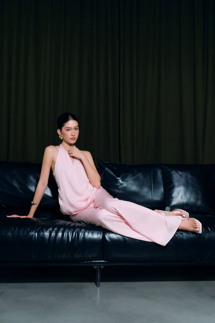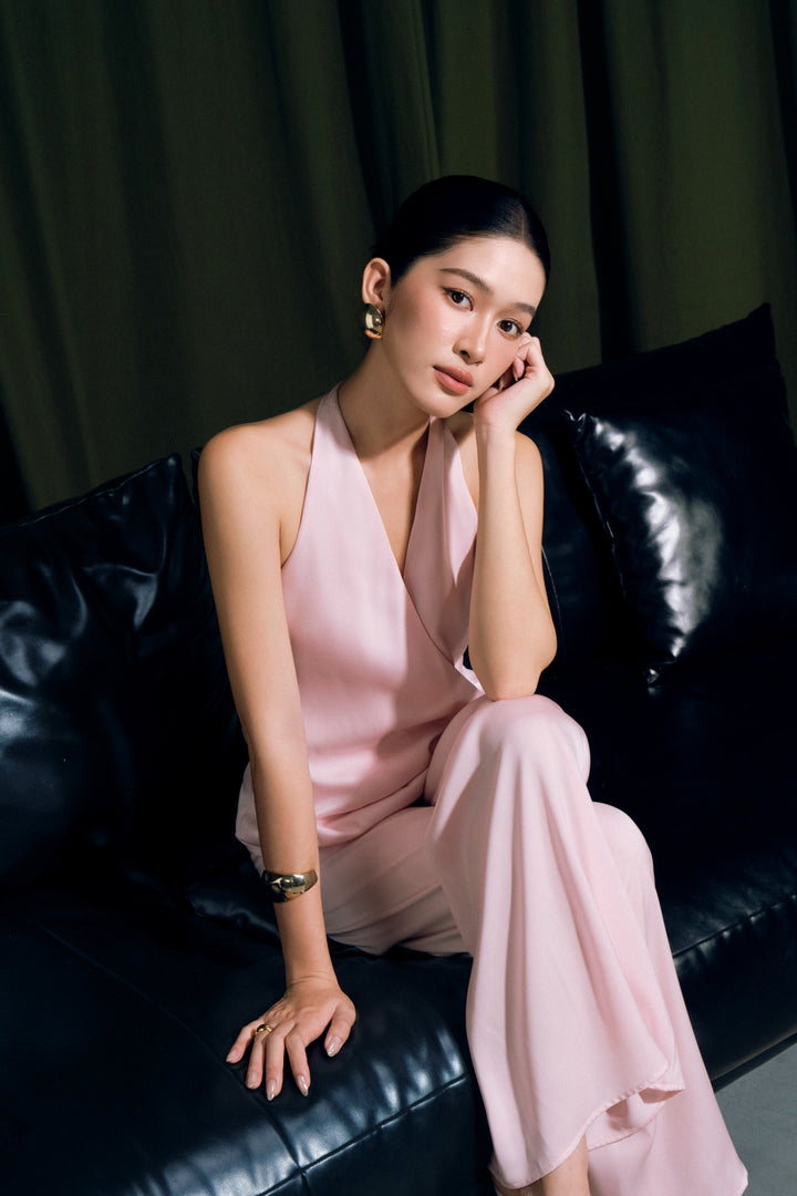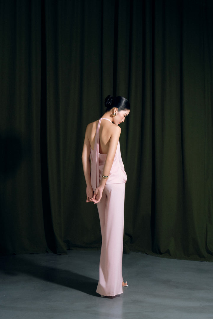 This beautiful two-piece ensemble, featuring a plunge-neck halter top and wide-leg trousers, embodies effortless sophistication. Crafted in a delicate blush tone, the set uses a soft, flowing fabric that drapes elegantly across the body, creating a look that is both comfortable and luxuriously chic for any elevated evening or daytime event.