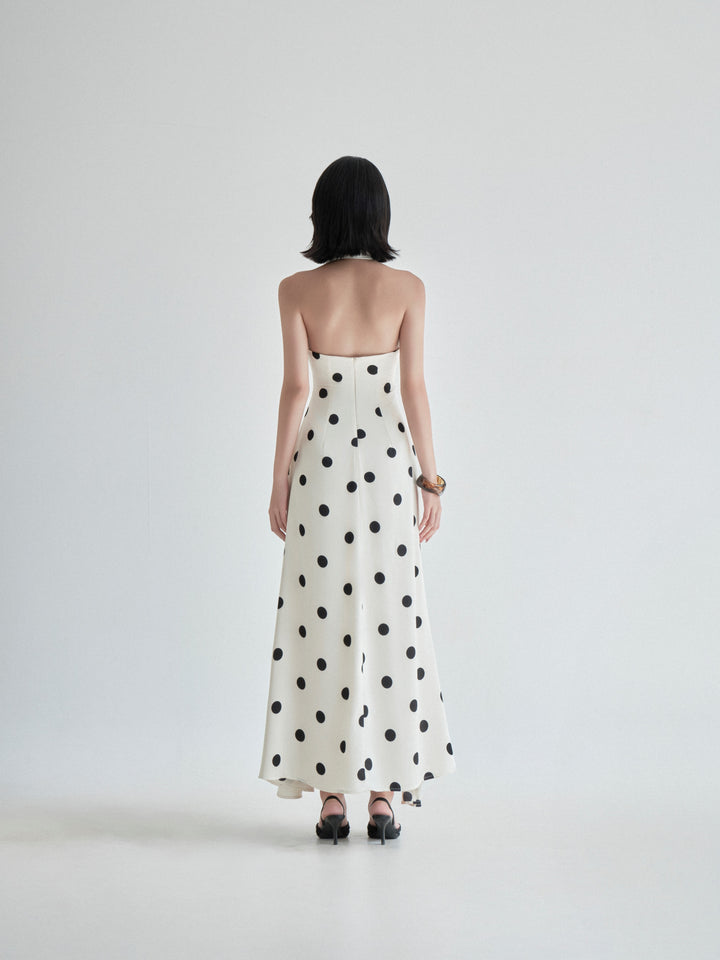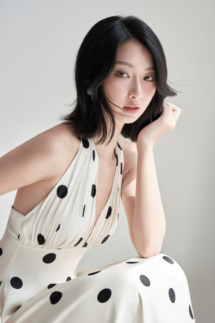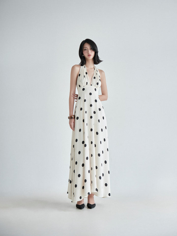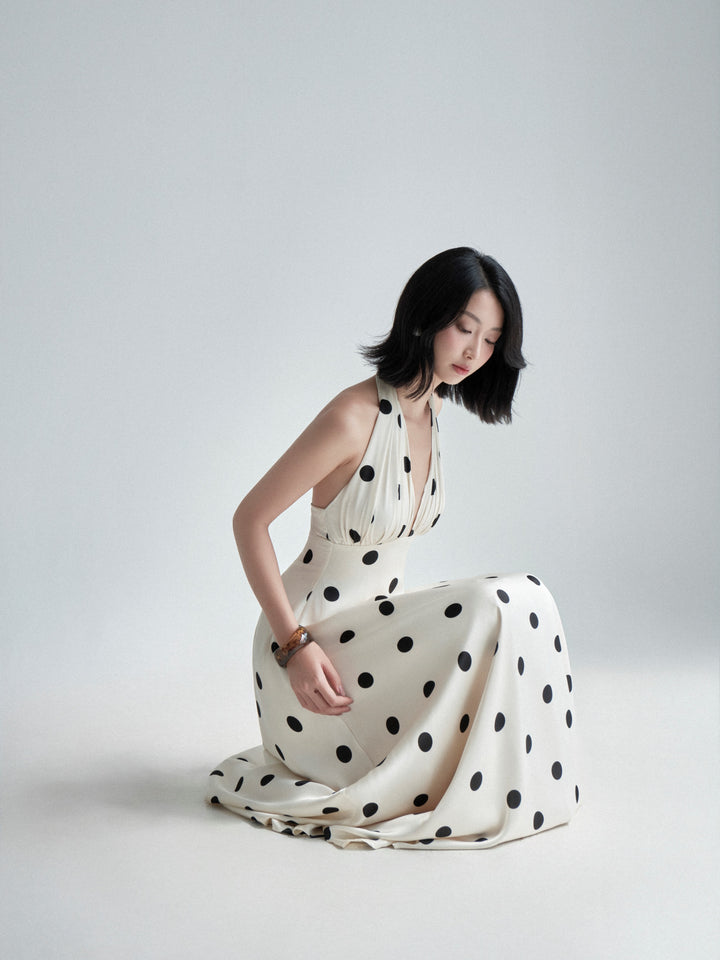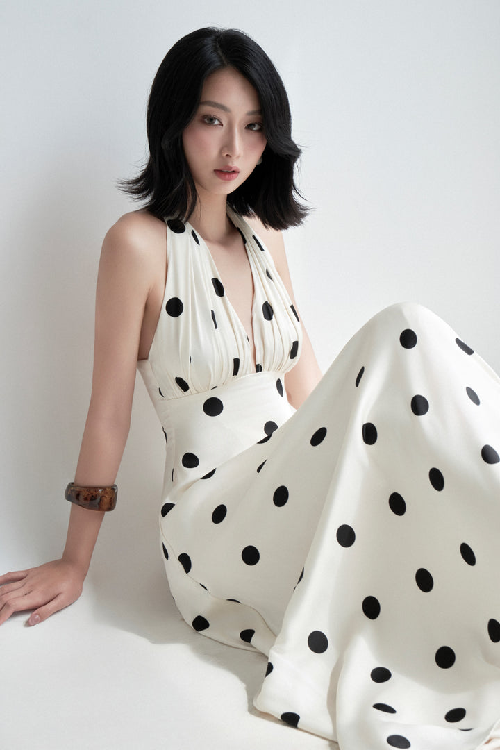 This stunning maxi dress captures a timeless elegance with its bold, black polka dot pattern against a light, off-white background. It is fashioned from luxurious silk fabric, giving it a beautiful drape and lustrous finish. The dress features a flattering halter neckline with a plunging V-neck and ruched detailing at the bust, leading to a fitted bodice and a flowing, full-length skirt. The silhouette and print evoke a glamorous, vintage-inspired feel, perfect for formal events or sophisticated evening occasions.