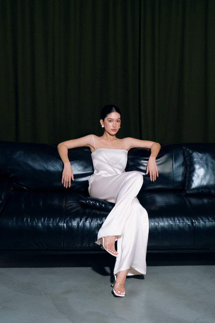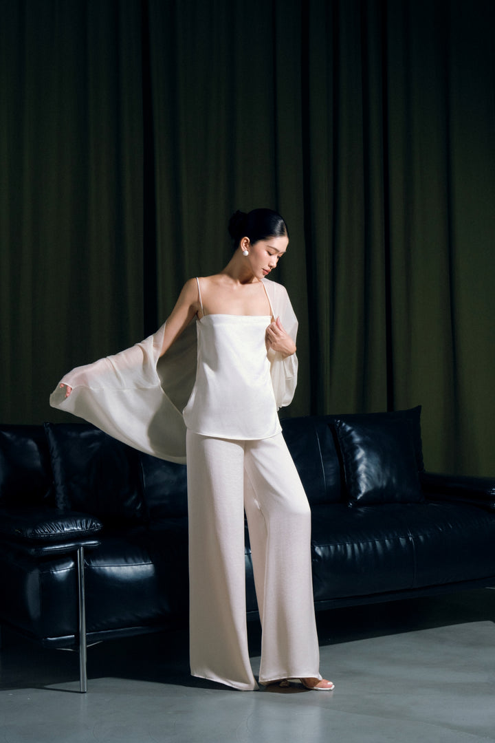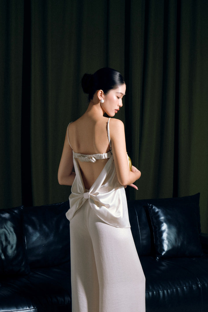 This sophisticated white set features a graceful spaghetti-strap top with a striking low back and a beautiful bow detail. Paired with elegant wide-leg trousers, this two-piece ensemble creates a look that is both modern and timeless.