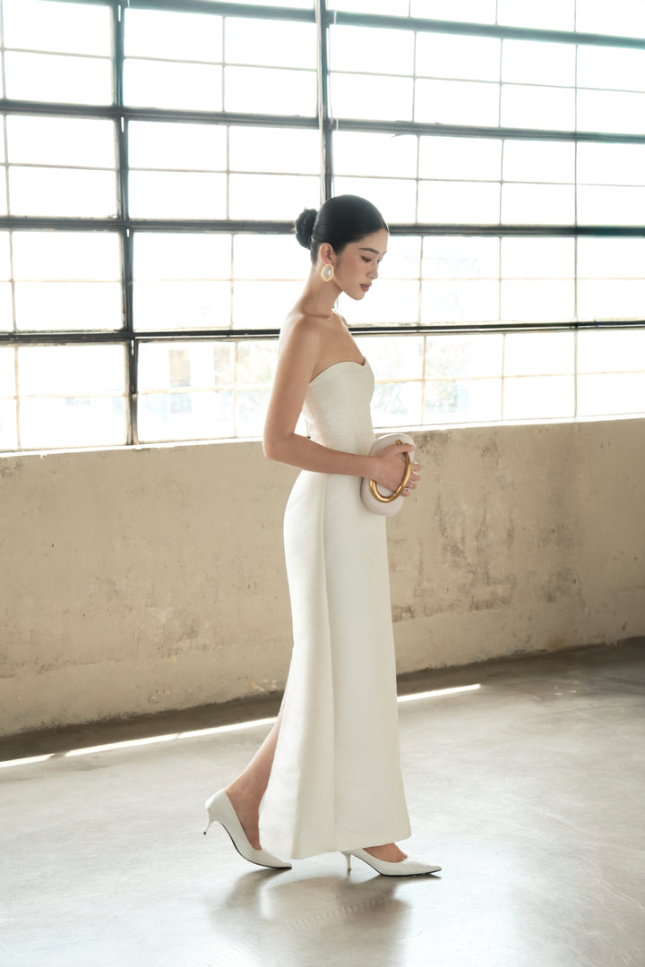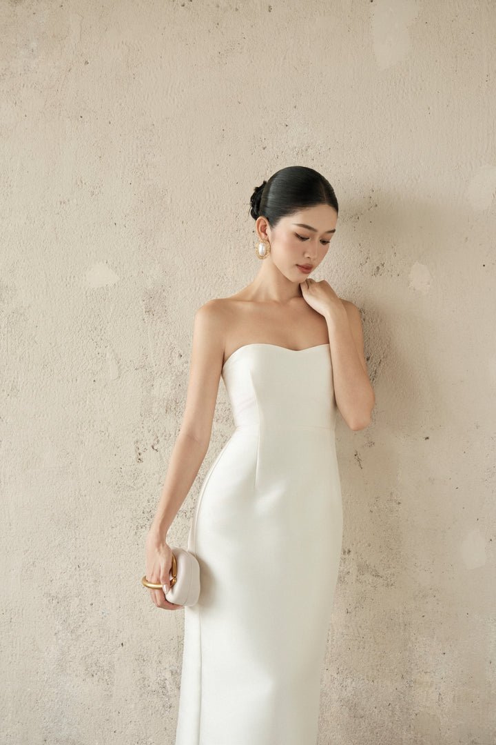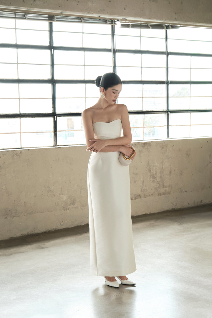 Experience the timeless allure of taffeta with this sleek, strapless floor-length gown. Known for its beautiful crispness and subtle sheen, taffeta lends an architectural quality to the dress, allowing the fitted bodice and straight column silhouette to hold their shape perfectly. This dress is a testament to minimalist elegance, creating a polished and sophisticated look that’s ideal for a bridal look, an upscale evening event, or any occasion demanding refined simplicity.
