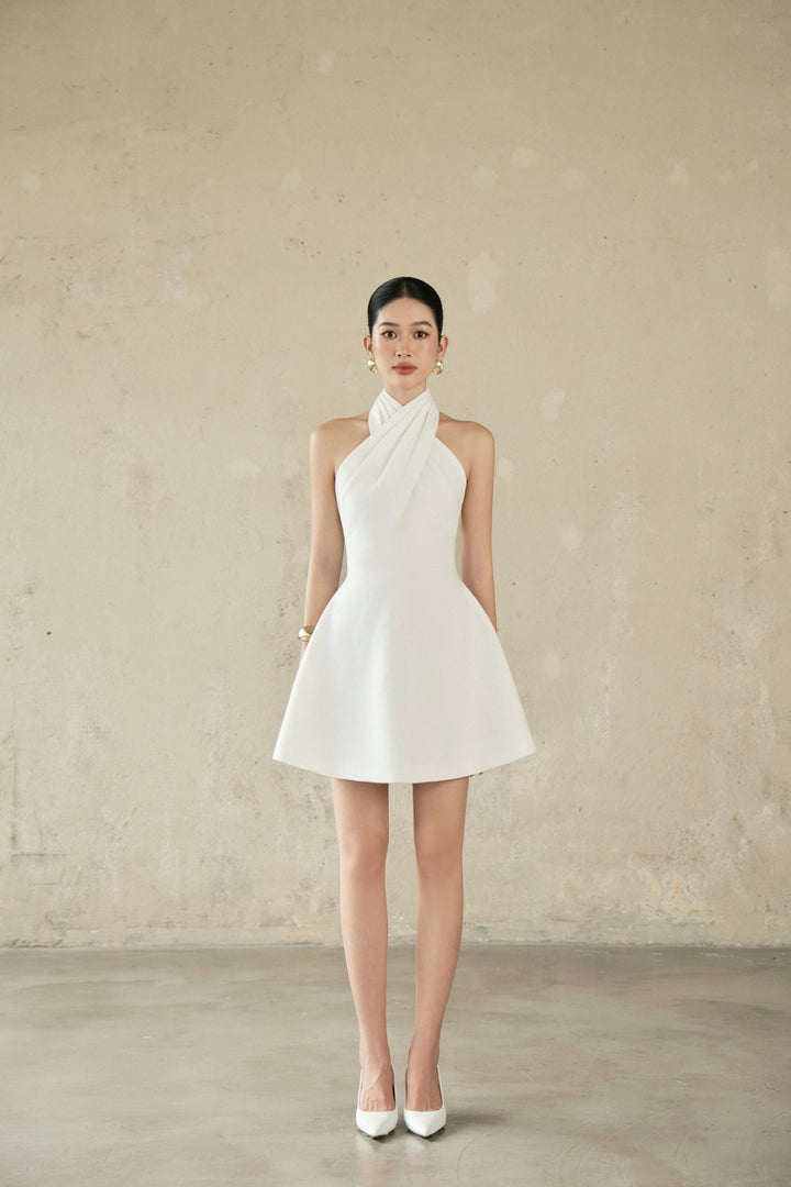 Exude contemporary elegance in this chic halter-neck mini dress, expertly crafted from a crisp, structured suit fabric. The choice of fabric allows the dress to maintain its striking silhouette, from the beautifully draped and twisted halter neckline that frames the shoulders, to the fitted bodice and the subtly flared A-line skirt. This dress offers a modern, polished look perfect for a stylish cocktail party, a sophisticated daytime event, or any occasion where you want to make a refined statement.