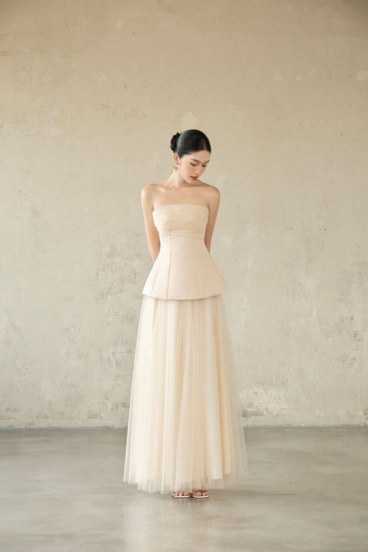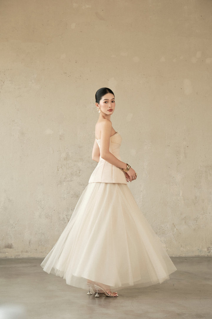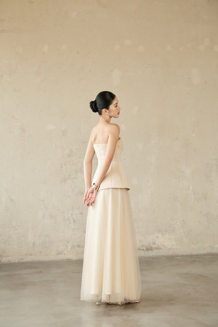 This top beautifully contrasts sharp tailoring with soft texture. The main body, which appears to be crafted from crisp taffeta fabric, features a flattering corset-like construction that cinches the waist. The defining characteristic is the dramatic, subtly flared peplum detail, which gives the top an architectural quality and a modern, high-fashion edge. This sophisticated piece is the perfect complement to the soft, flowing tulle skirt it's paired with, making it ideal for elevated evening events or a contemporary bridal look.