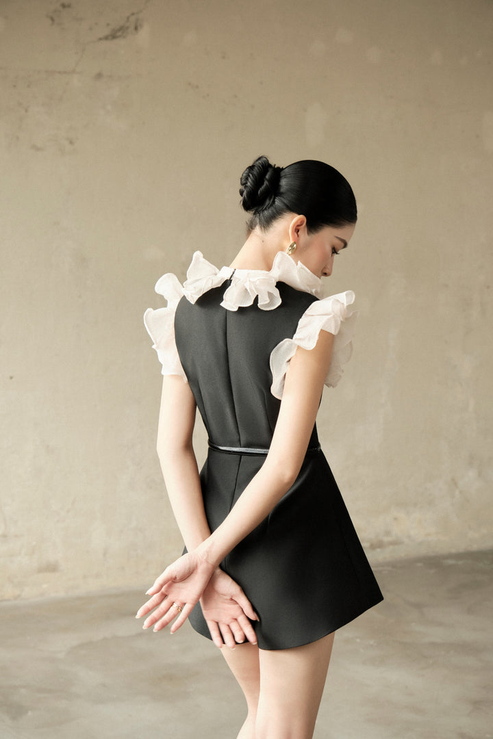 The main body is crafted from a substantial, structured suit fabric, providing a sharp, flattering silhouette with its deep V-neckline, defined waist, and playful flared shorts. This structure is beautifully contrasted by the dramatic, voluminous organza ruffles detailing the shoulders and collar. The sheer, airy quality of the organza adds a touch of romantic whimsy to the power of the black suit fabric, creating a perfect balance for an evening out or a stylish party.